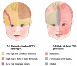 המאפיין המוקדם והבולט ביותר הוא כתם עור בצבע ורוד עד סגול, המופיע לרוב על המצח או העפעף העליון. כאשר הכתם גדול, דו־צדדי או מערב אזורים מרכזיים בפנים, עולה הסיכון למעורבות מוחית משמעותית. מעבר לביטוי הקוסמטי, לתסמונת יש השלכות נוירולוגיות, עיניות והתפתחותיות מורכבות, המצריכות מעקב וטיפול רב־תחומי מתמשך.