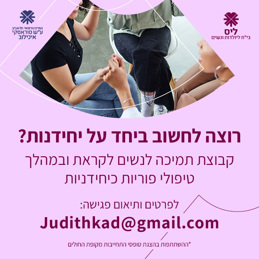 ניתן לקבל לווי פסיכולוגי במסגרת מכון הפריון. הלווי כולל פגישות ייעוץ בודדות או תהליך ממוקד וממושך יותר. הפגישות הינן פרטניות, זוגיות וקיימת גם קבוצת תמיכה ליחידניות לעתיד.השירות ניתן ע"י גב' ג'ודית קדוש קובלסקי, פסיכולוגית קלינית ופסיכולוגיךת המכון באמצעות טפסי 17 מקופות החולים. ליצירת קשר יש לפנות ל 03-6925753, או למייל judithko@tlvmc.gov.il. למידע נוסף >